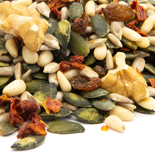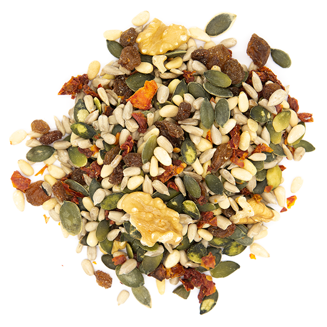 مزيج لذيذ ومتوازن، مثالي لإثراء سلطاتك، وأطباقك المتوسطية، أو وصفاتك المغربية المُعدّلة. يجمع هذا المزيج بين قرمشة البذور والمكسرات ونعومة الفواكه المجففة، ولمسة من نكهة الطماطم المجففة.